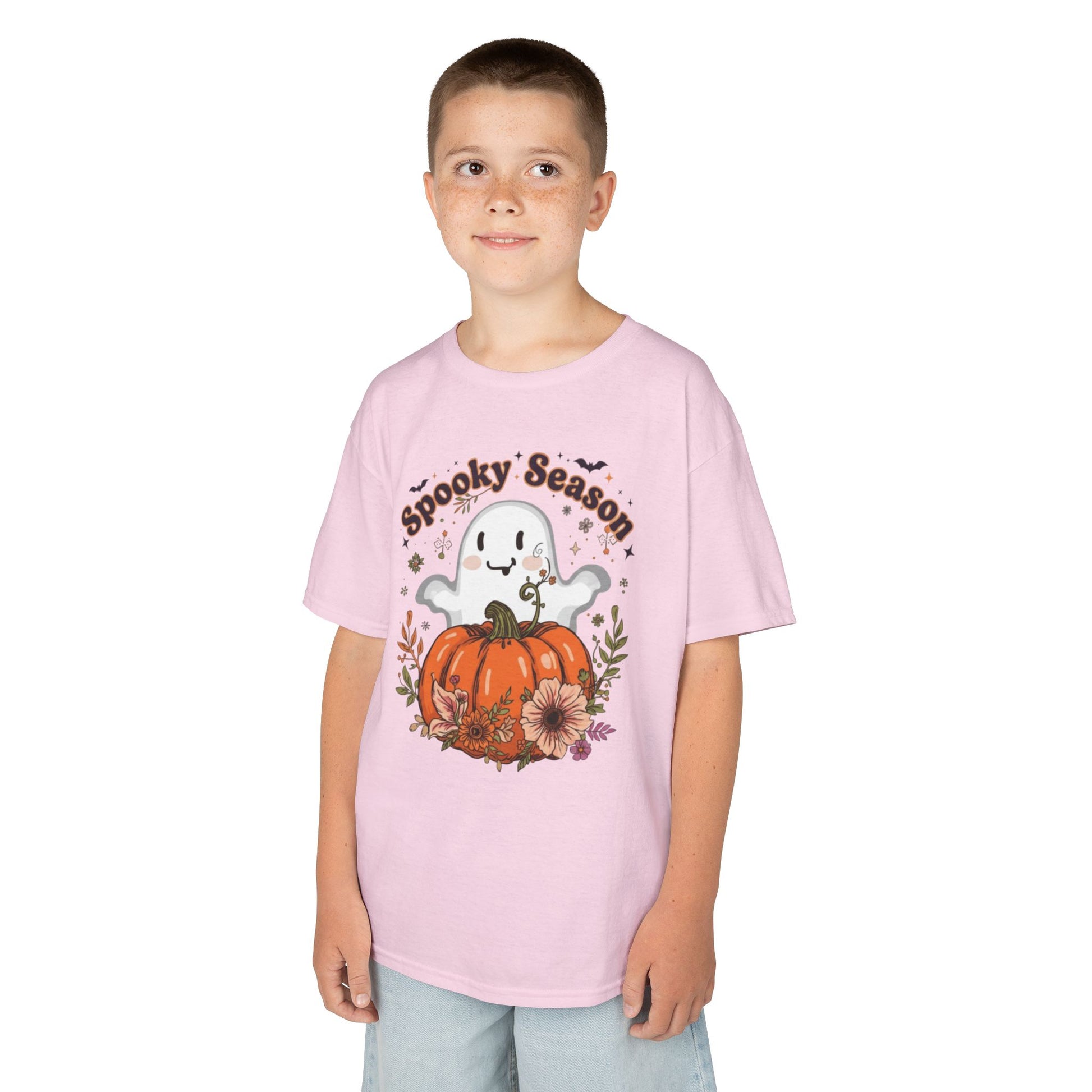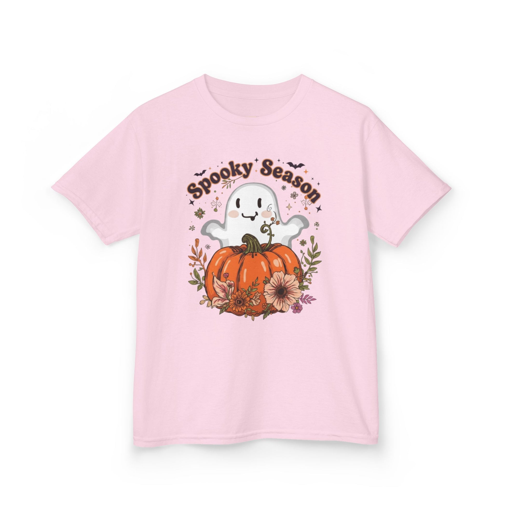 Get your little one ready for Halloween with this cute Kids Tee featuring spooky season phrase with ghosts and pumpkin graphic perfect for little trick-or-treaters or as part of a fun Halloween outfit.